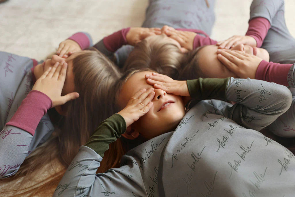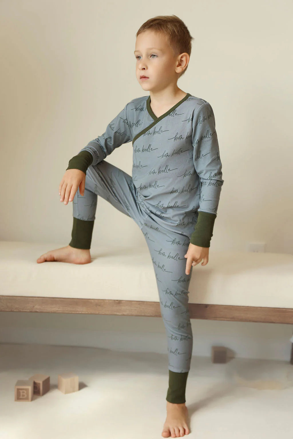 Turn nighttime into style time with this gray pajama, adorned with scribbled logos and playful green pops.