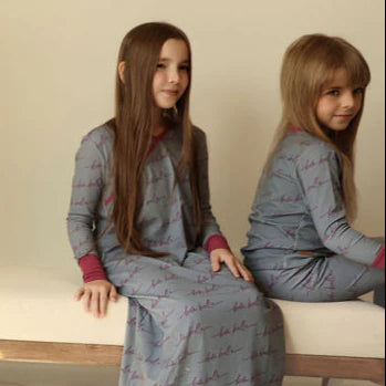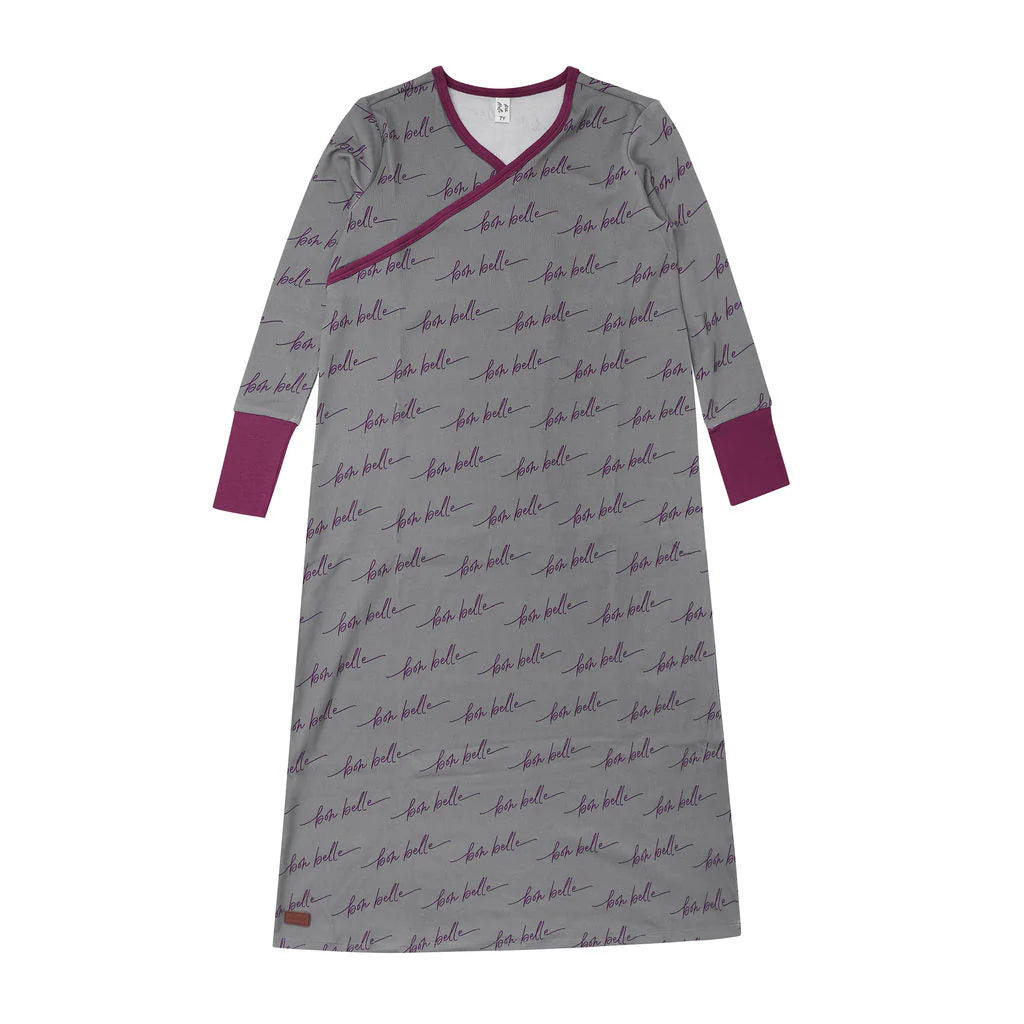 Turn nighttime into style time with this gray nightgown, adorned with scribbled logos and playful wine pops.